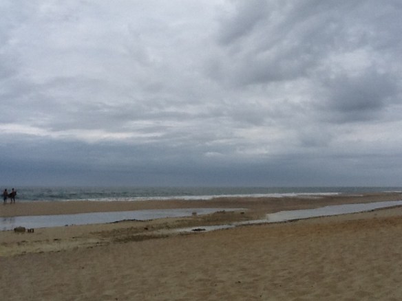 Low tide, Maguire Landing, Wellfleet, September 2012. The silhouettes on the far left are two boys who zigzagged back and forth, skimming over the shallow pools of sea water with their boards.