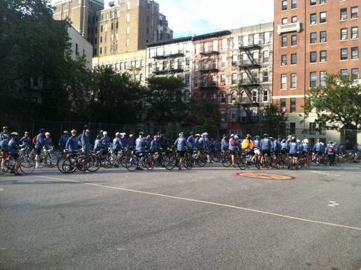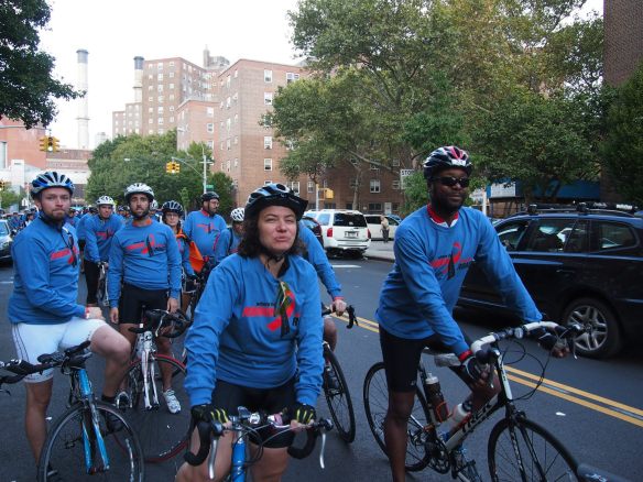 Braking the Cycle riders gathering together in the holding area on East 12th Street, three blocks from Housing Works’ Cylar House, where closing ceremonies took place. This way, we get to ride in all together. Photo courtesy of Joseph Miceli-Magnone.
