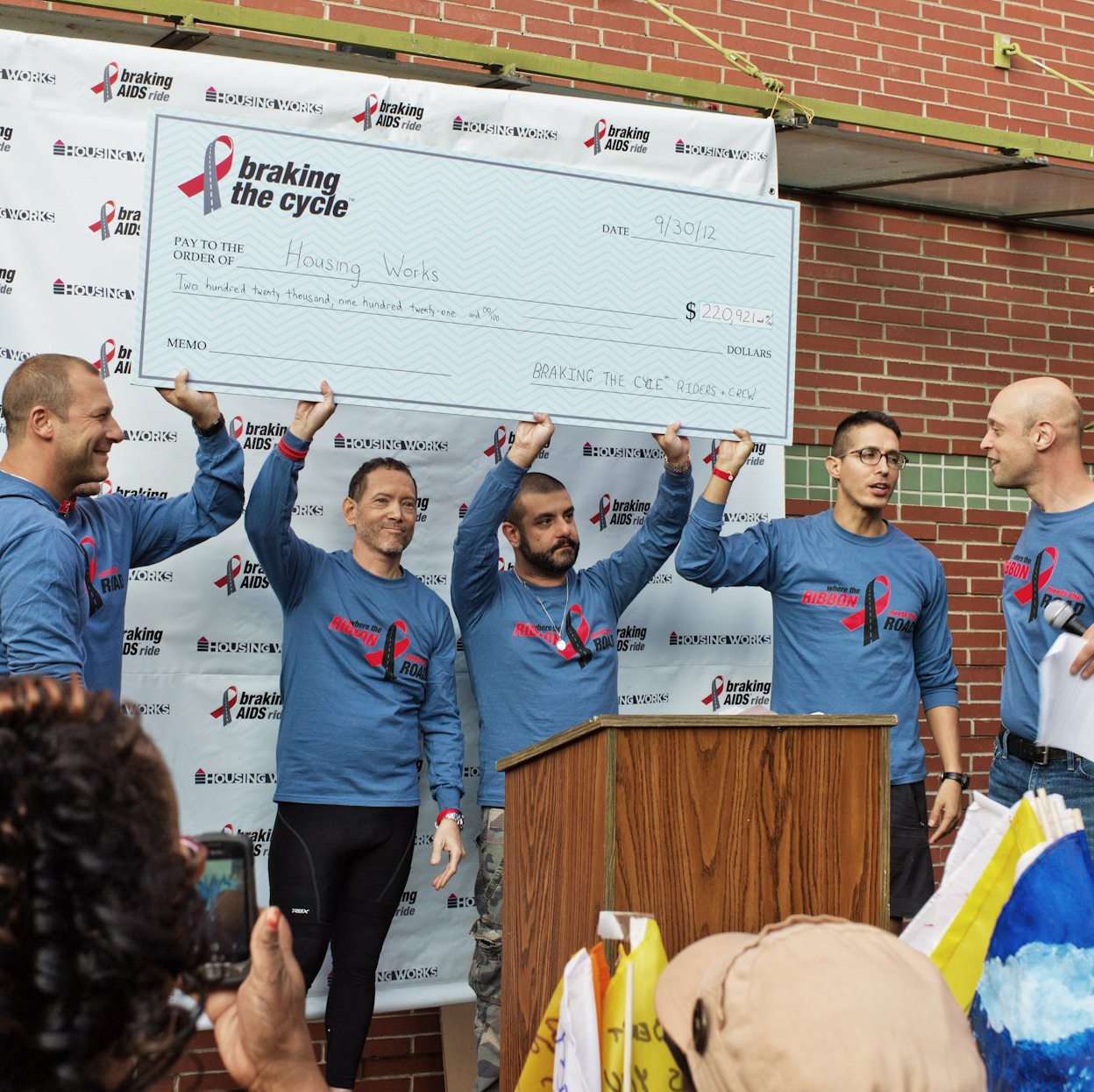 The check for nearly $221,000 that we presented to Housing Works at closing ceremonies, Sunday, September 30, 2012, 5:30pm. The actual final total will be higher, as riders and crew continue to fundraise until the end of October. Photo courtesy of Rich Biletta.