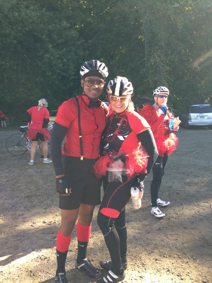Riders Henry Bolden and Brigid Siegel, hotties dressed for success, Red Dress Day, BRAKING AIDS® Ride, September 2013.