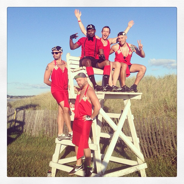 Every year on the ride, one day is declared Red Dress Day. Originally called Dress-in-Red Day, the concept came from one of the early AIDS rides many years ago; the idea is to have every rider wear something red so that from a distance, the riders cycling along the road would look like a red ribbon. The BRAKING AIDS® community being the creative, kooky, fun-loving bunch that it is, it’s also the day that many riders don an elaborate costume of one sort or another—everything from a red bike jersey to an Incredibles superhero outfit to a vinyl red bustier to a red tutu to red fishnet stockings to yes, a red cocktail dress.