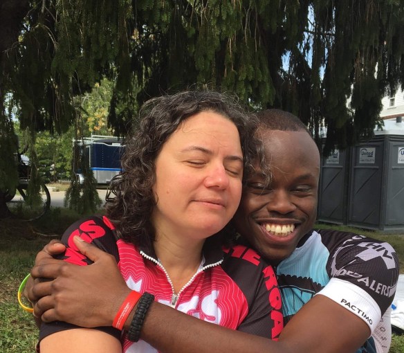 Me, with my friend and fellow rider Jamil Wilkins, during BRAKING AIDS® Ride 2016, getting a hug after the first 60 miles of riding.