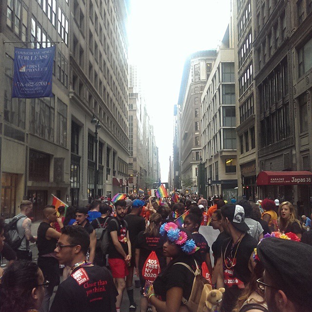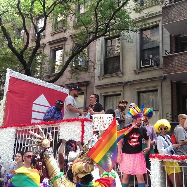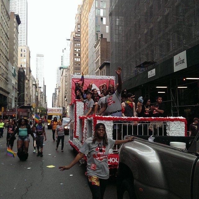 The Housing Works float, during the long wait to march at #NYCPride, June 28, 2015. I think the thing that may have moved me most at Pride was the young kids we kept meeting throughout the day, strangers from Alabama and Arkansas and Indiana and even from New York or somewhere geographically closer, who kept thanking us and reaching over the police barricades to high-five us or hug us because they were so happy and they know what a big deal this marriage equality is. I couldn’t pinpoint what it was about their joy that was so beautiful and then I realized: They looked hopeful. Photo by Jennifer L. Anderson.